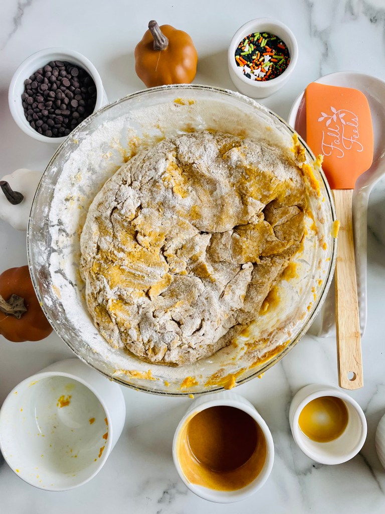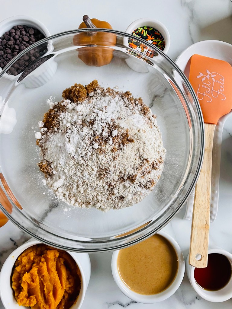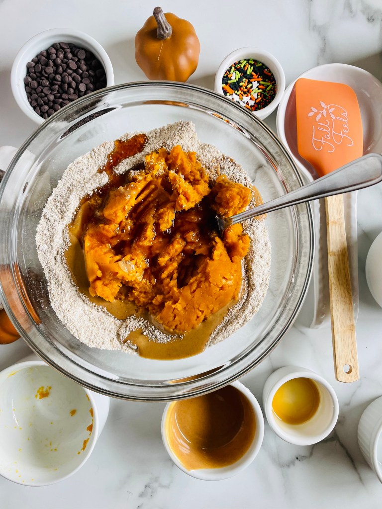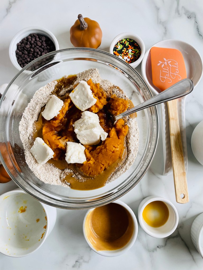 Next, toss in the pumpkin purée( I used the Trader Joe’s brand), peanut butter, vegan butter, maple syrup, and oat milk, then give it all another good mix. I used an electric hand mixer on low speed to ensure the butter gets evenly distributed, but be sure not to over mix.