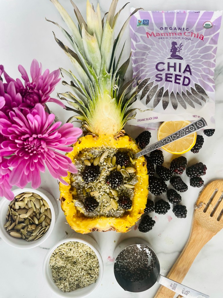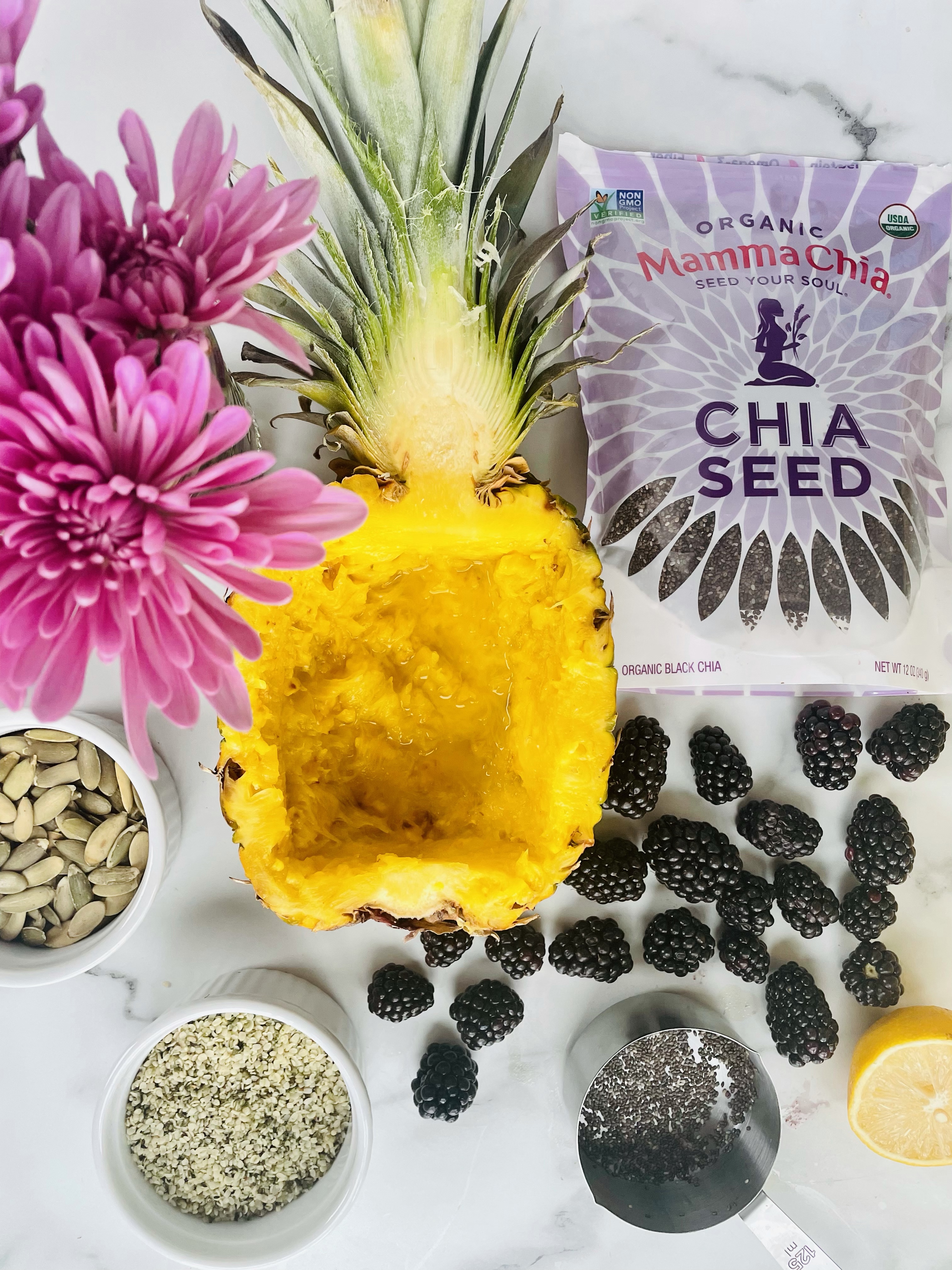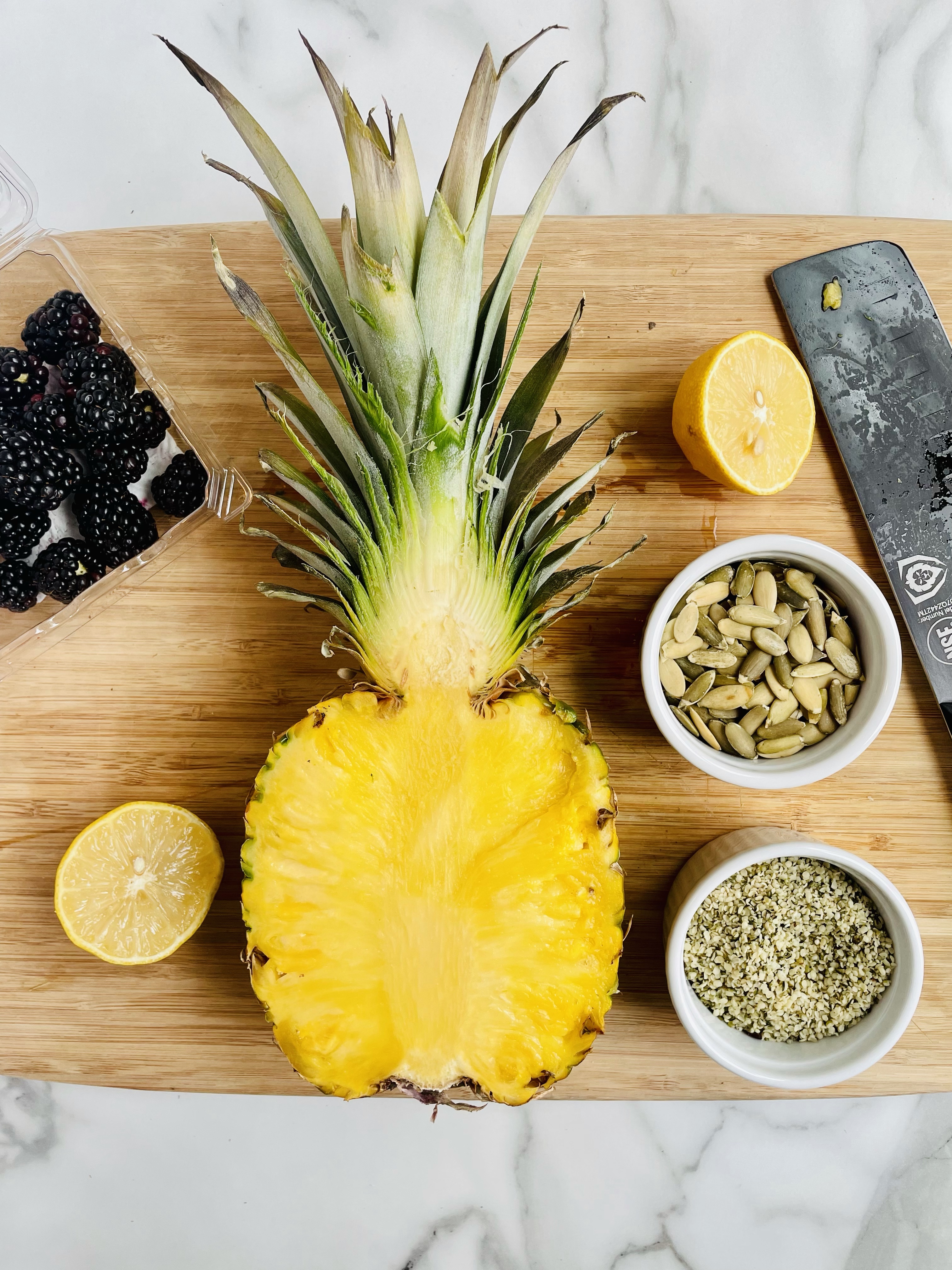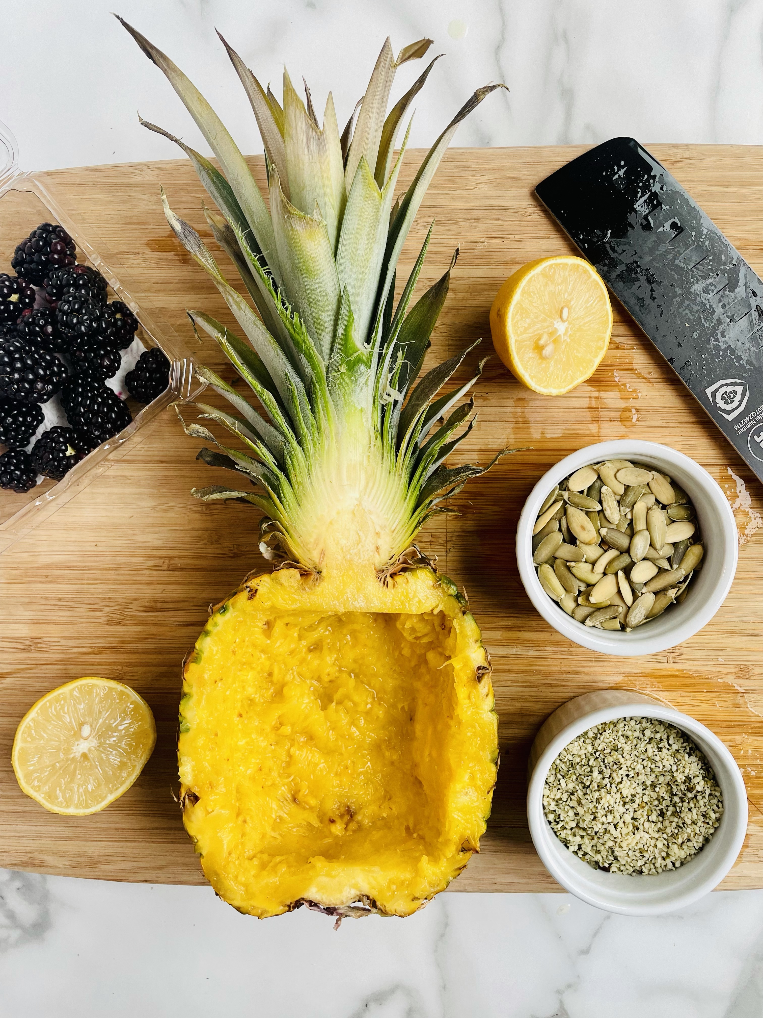 To plate, I served up the pudding in a bowl made from half of the pineapple and topped it with organic blackberries, pumpkin seeds, and hemp hearts.