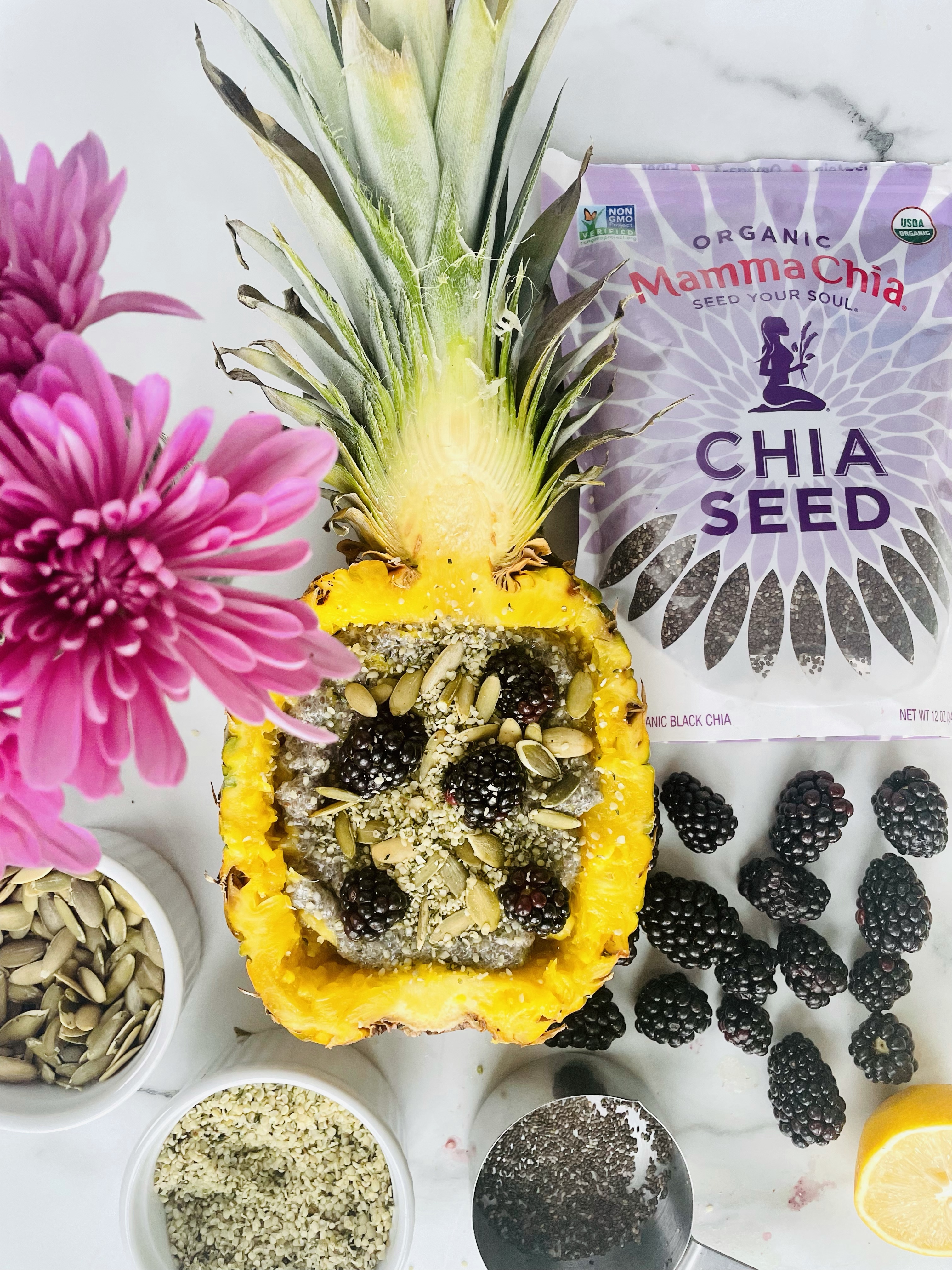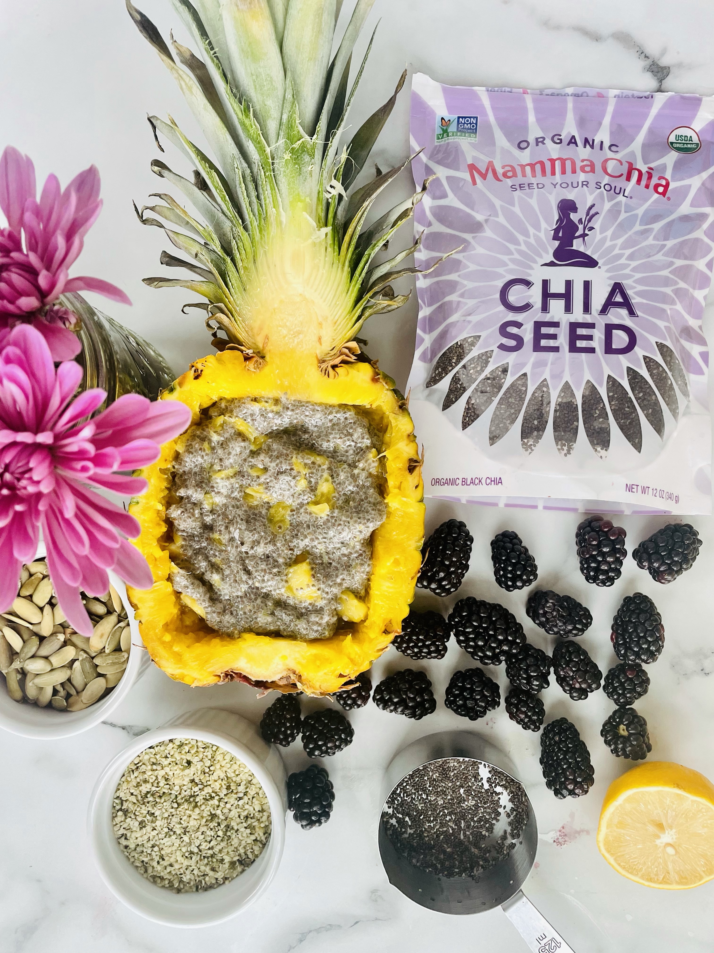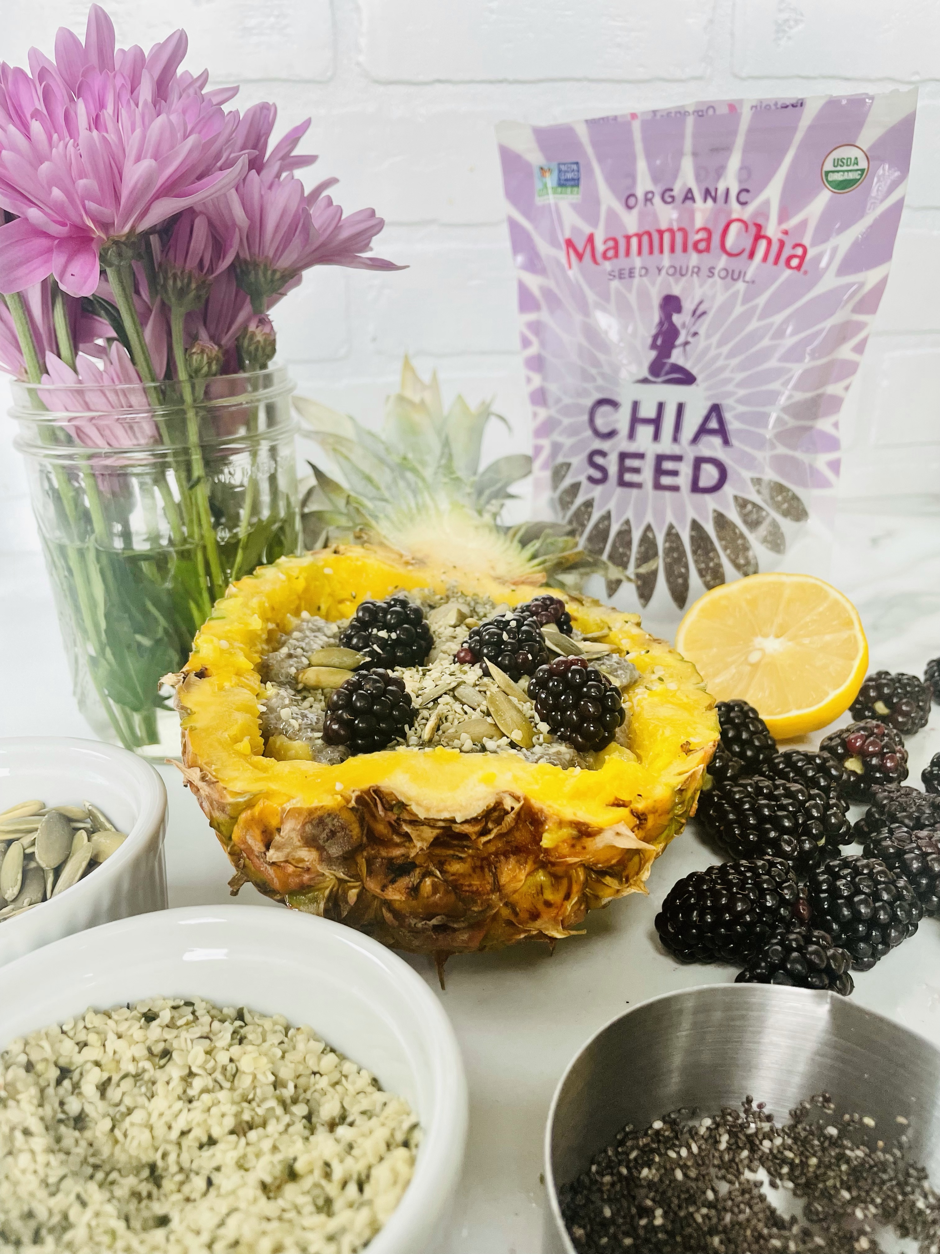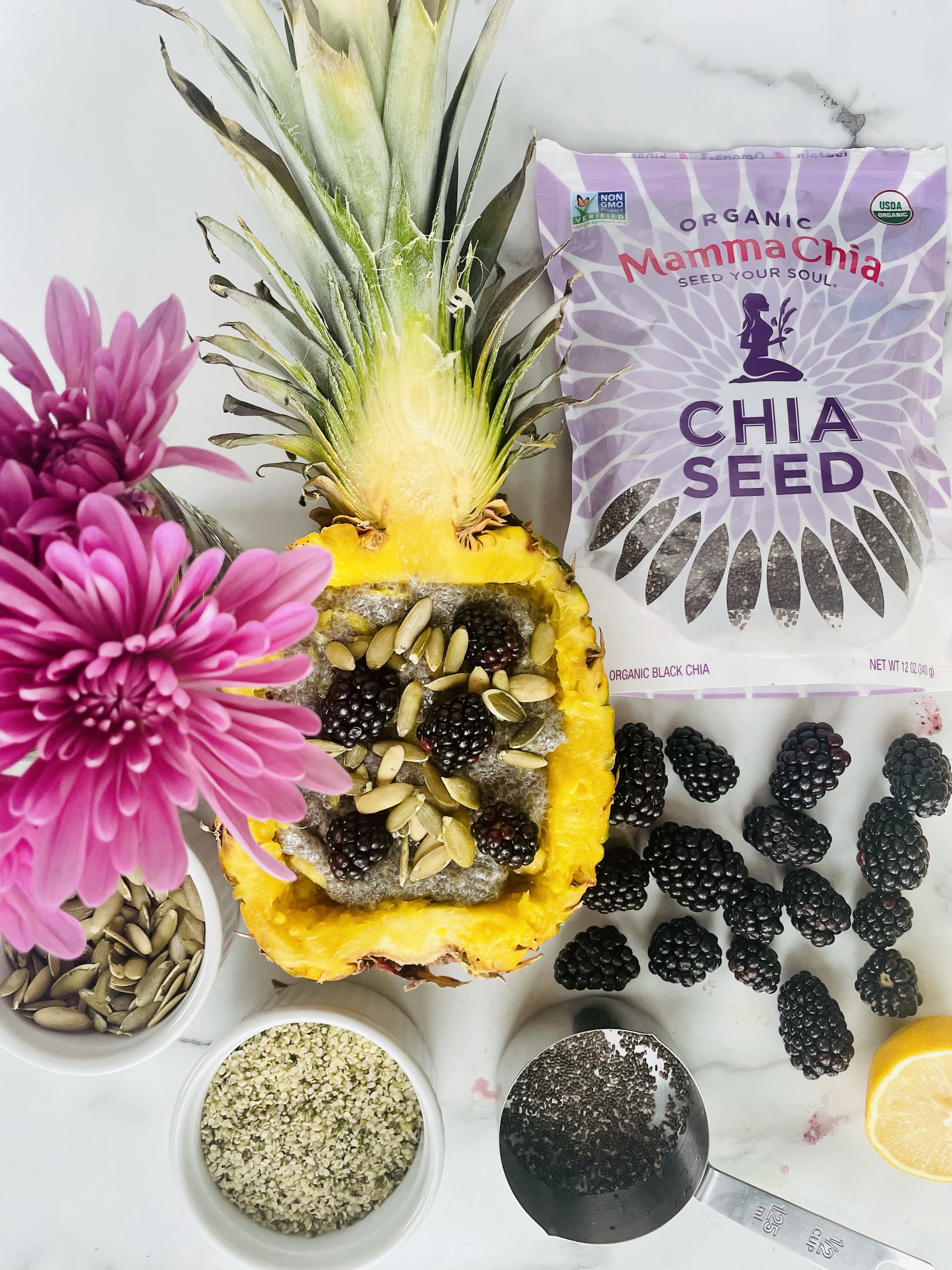 To plate, I served up the pudding in a bowl made from half of the pineapple and topped it with organic blackberries, pumpkin seeds, and hemp hearts.