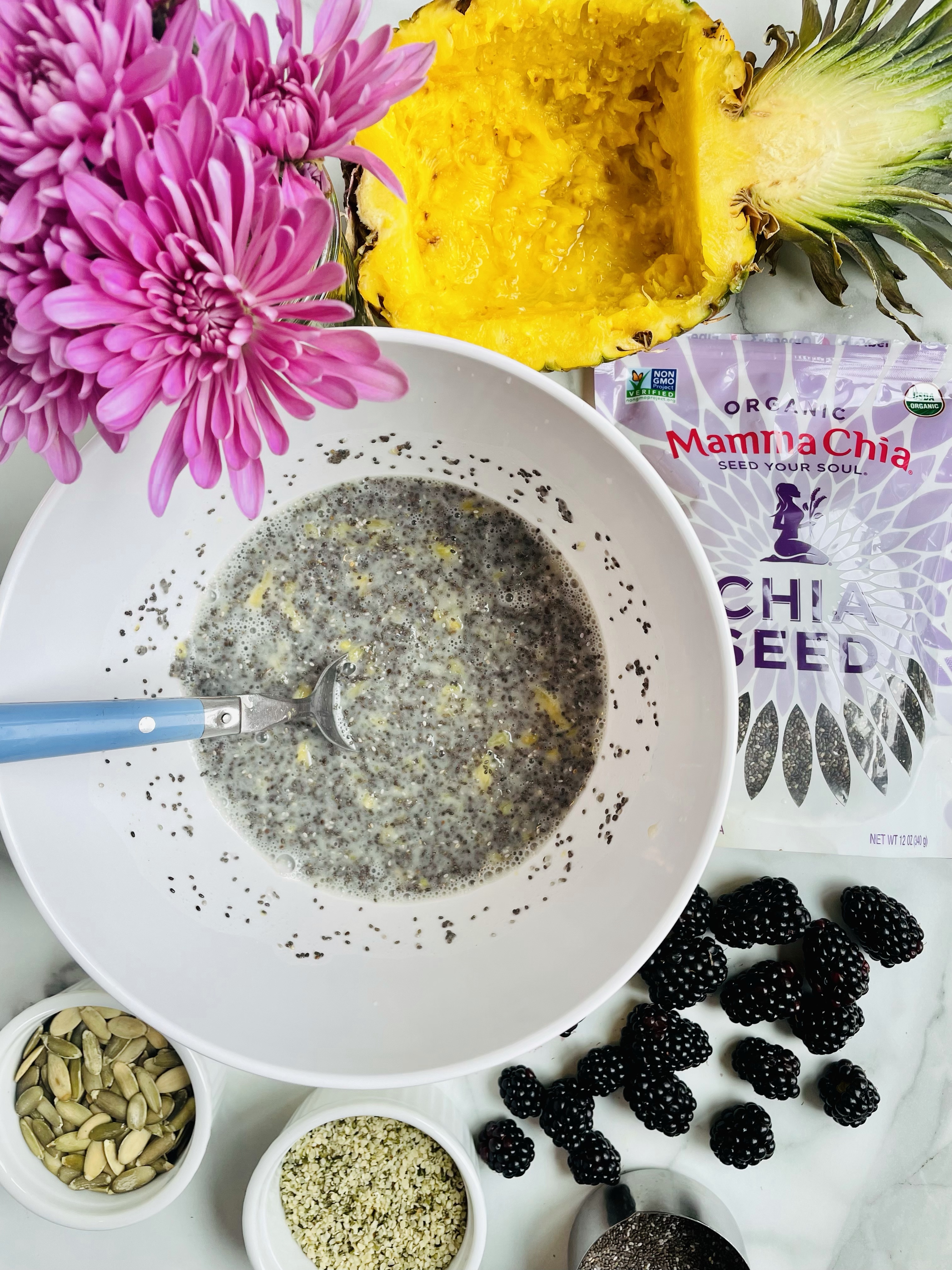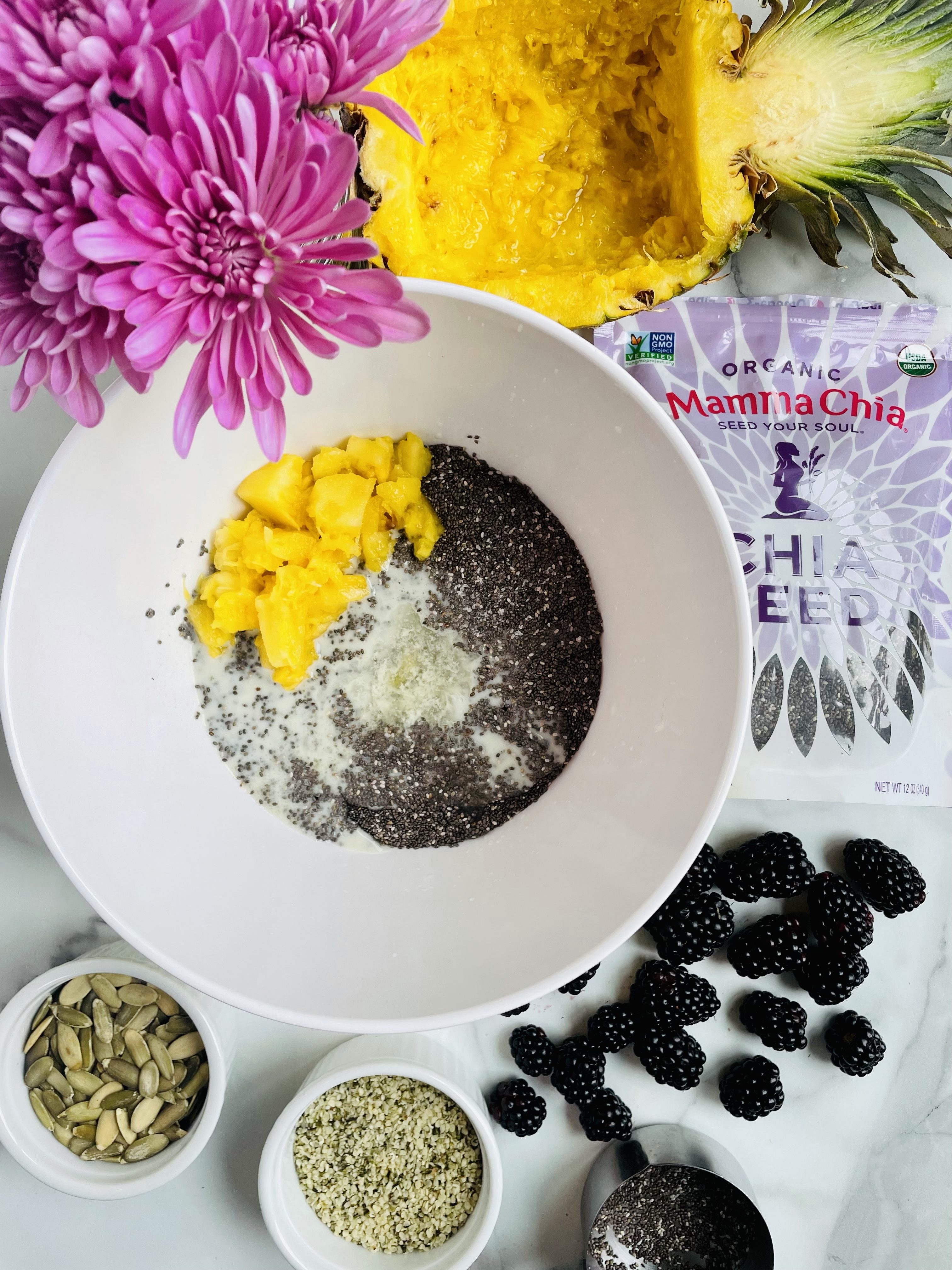 There are a ton of different ways to make chia pudding, but I decided to go with using fresh pineapple as the flavor of week as well as the chia seeds, oat milk, agave syrup, squeezed lemon juice, and dash of salt.