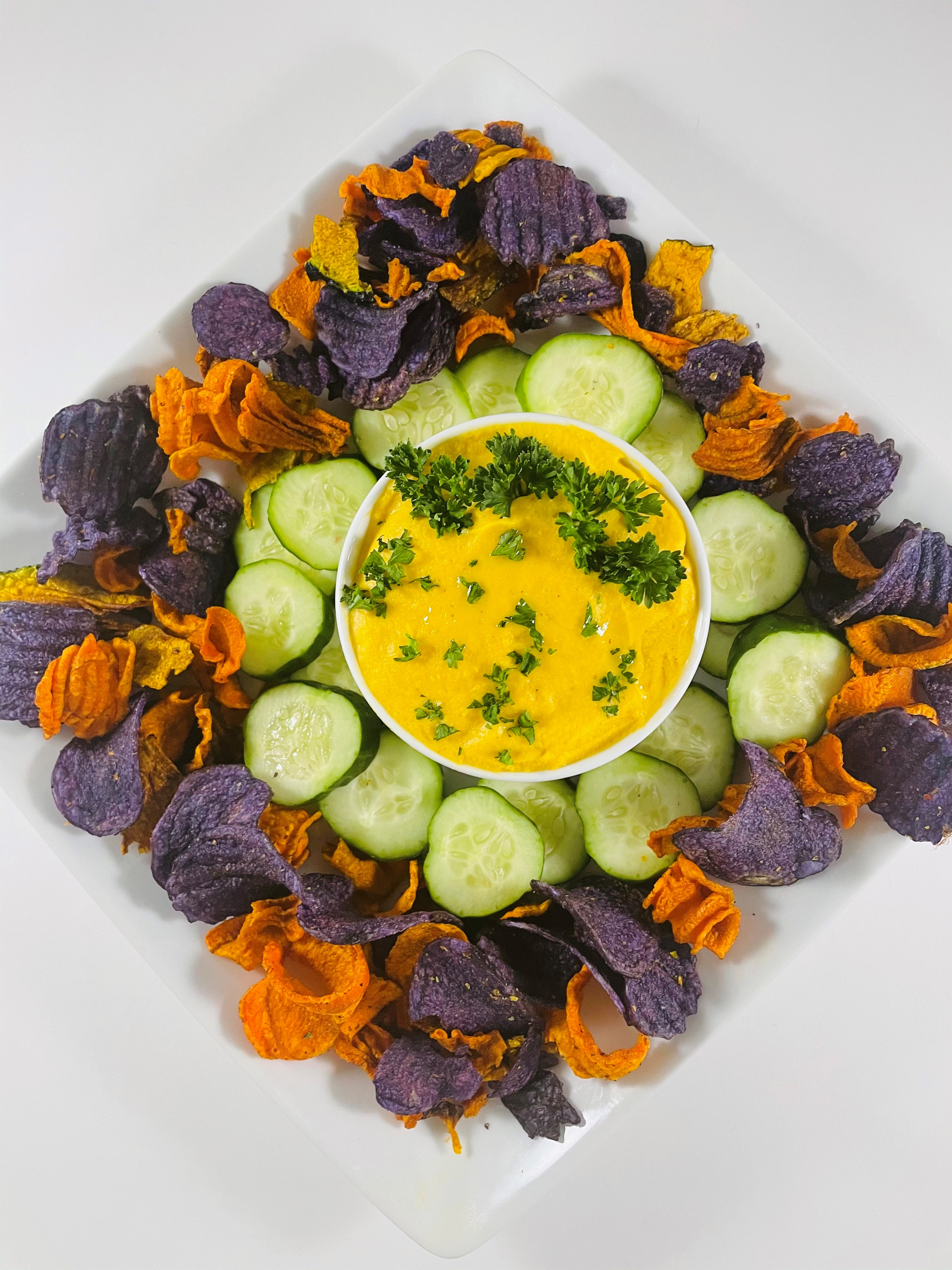 Sweet and savory spread with earthy undertones of fresh parsley paired with sliced cucumbers and fancy chips.