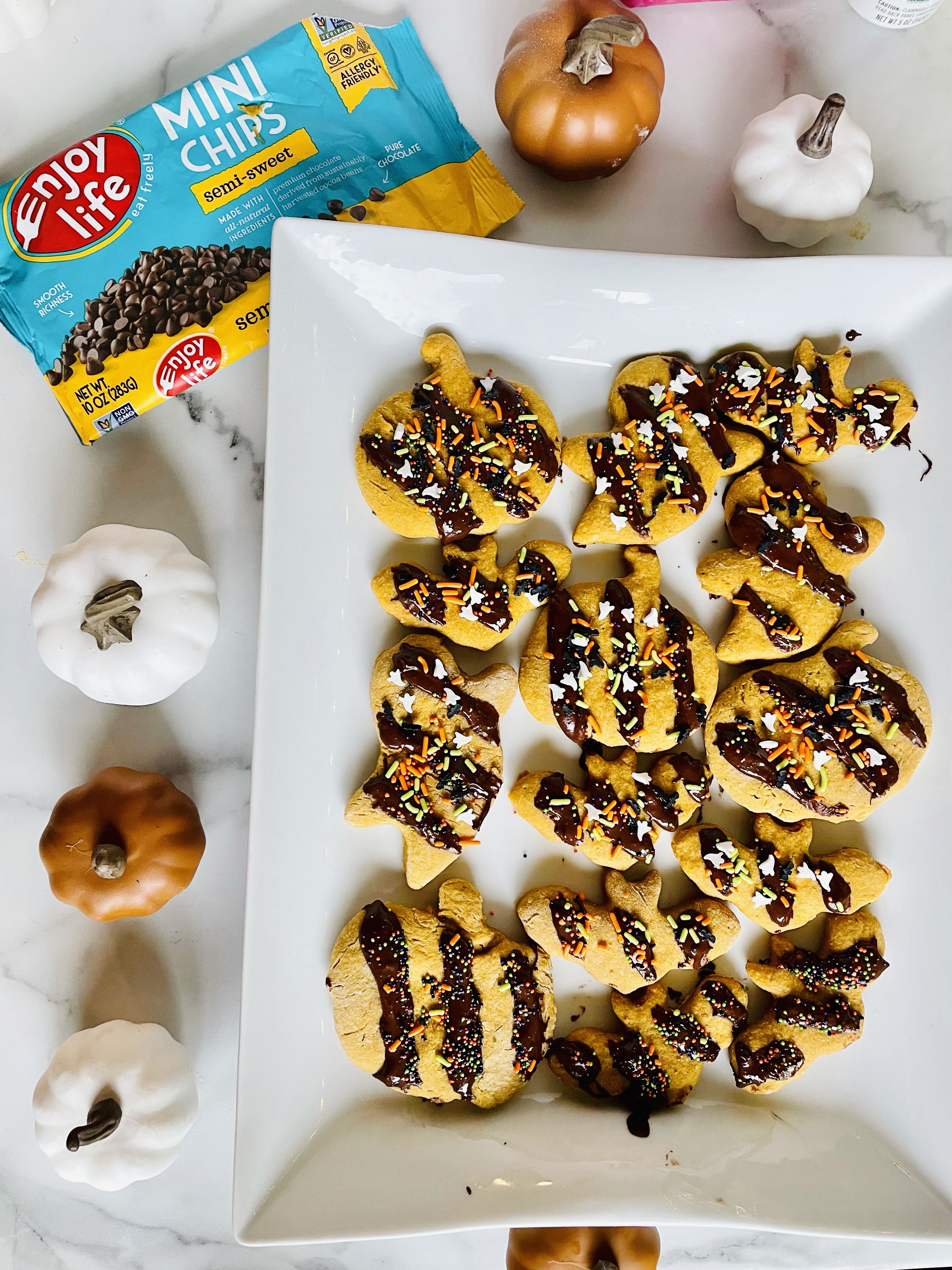 Halloween themed cookies made with homemade oat flour, pumpkin purée, and peanut butter. Drizzled with dairy free chocolate and dashed with spooky sprinkles.