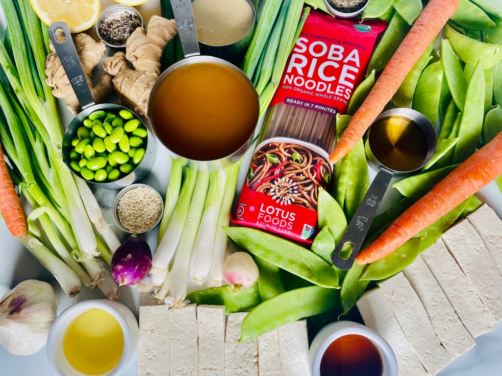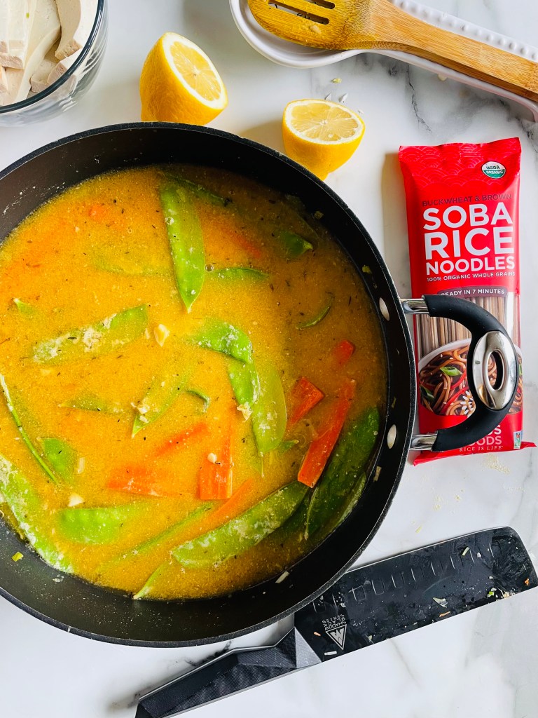 This soba noodle soup recipe features fresh ginger, garlic, green onions, carrots, and snow peas sautéed and simmered in avocado oil, coconut aminos, squeezed lemon juice, tahini, vegetable broth, dried thyme, salt and pepper.