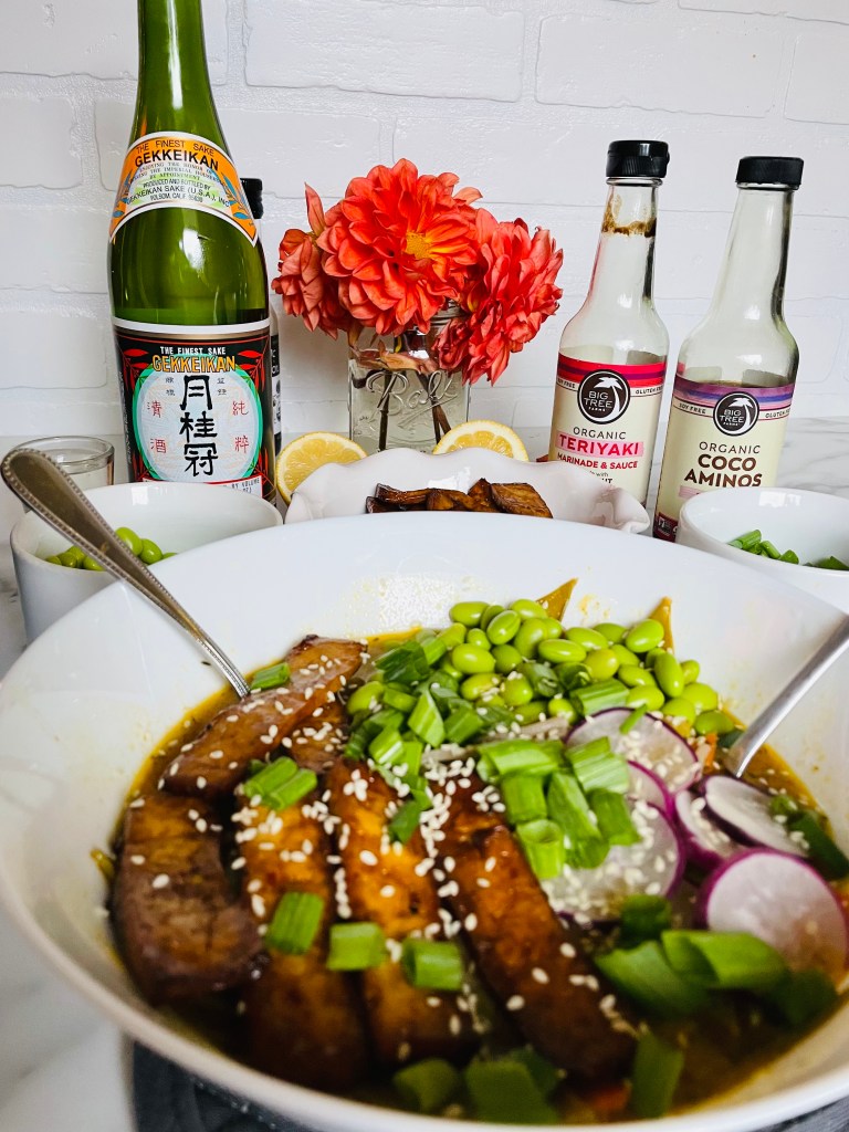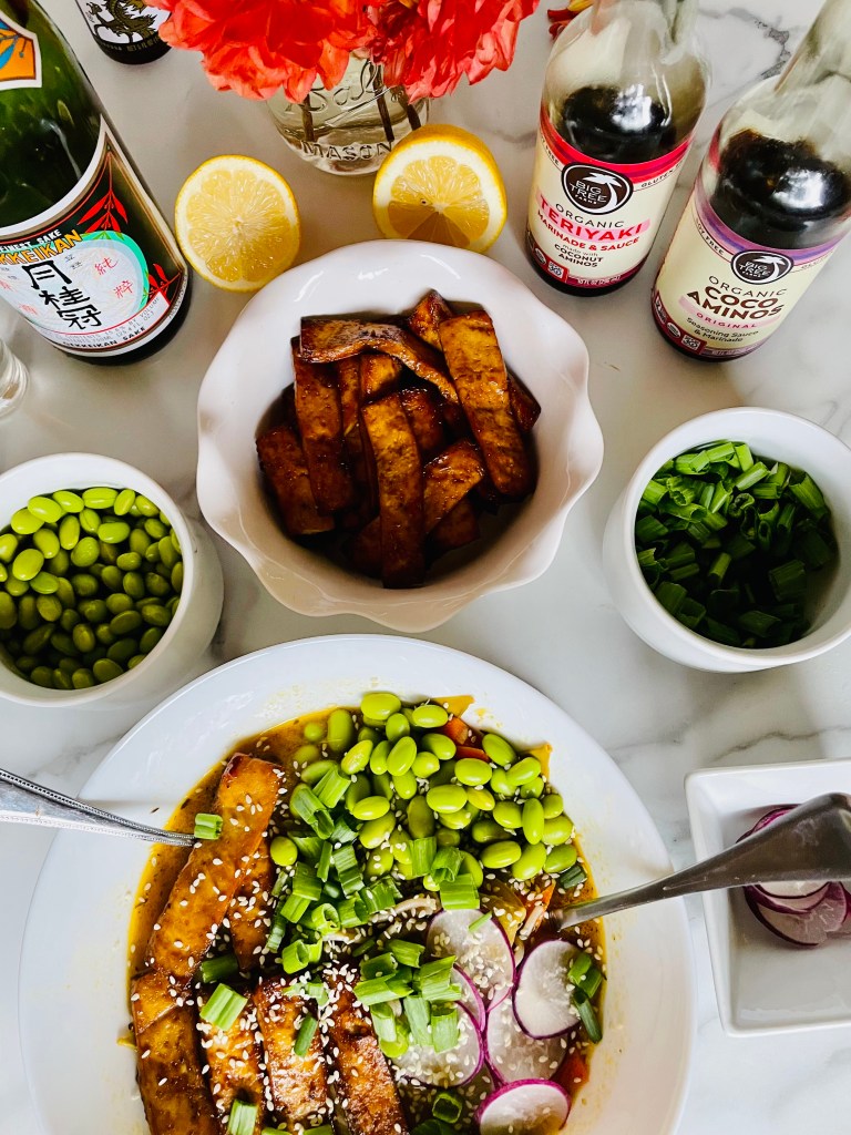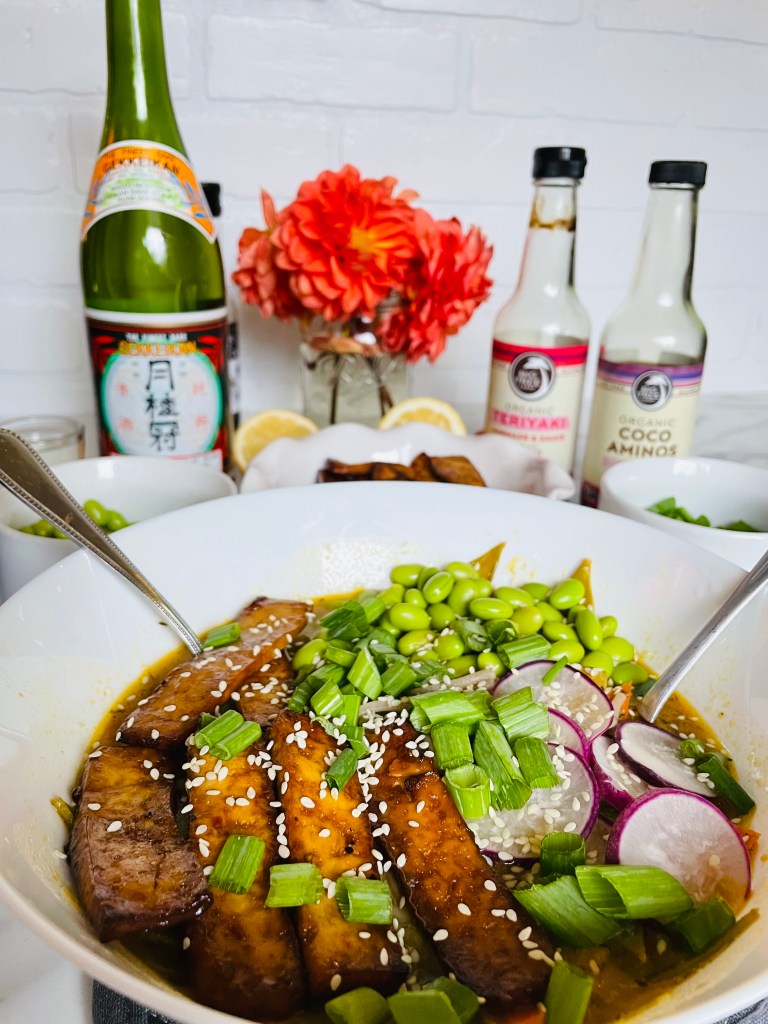 Finally, plate the soup by adding your noodles and the broth followed by the teriyaki tofu(if you decided to make it), edamame, the rest of the green onions (after you chop them), and a few dashes of sesame seeds.