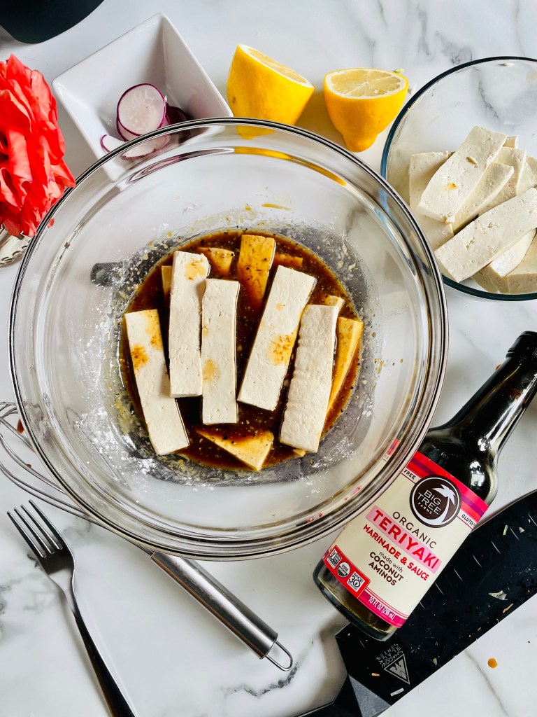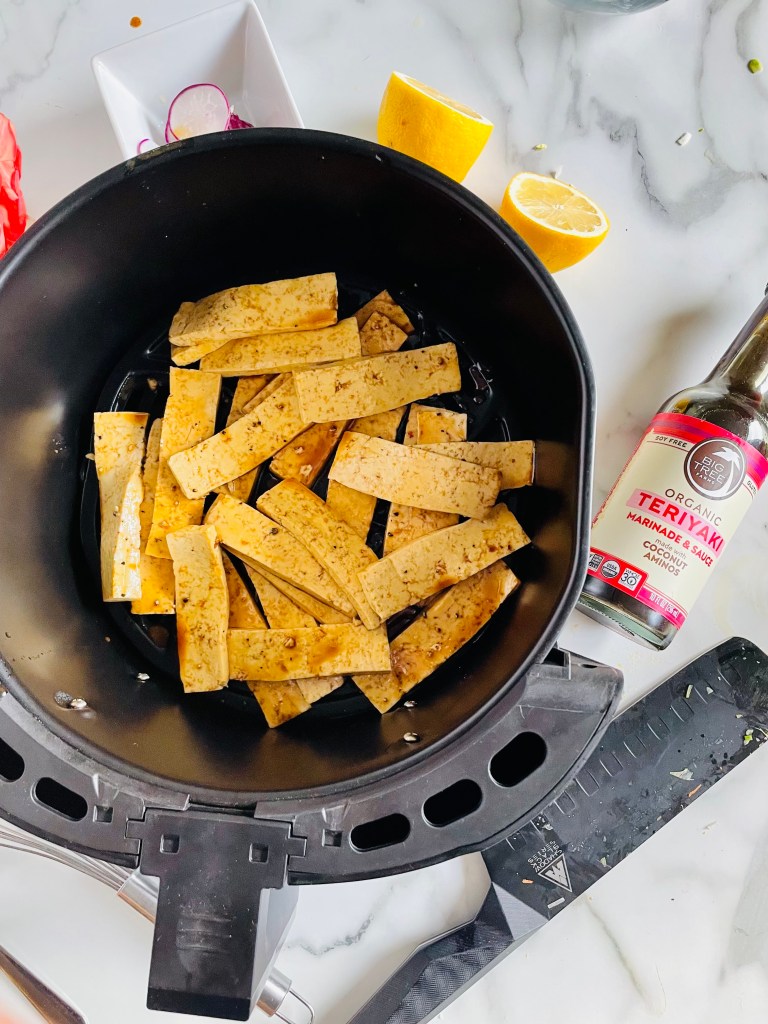 To get crazy with it, I also made air fried teriyaki tofu using teriyaki coco aminos from Big Tree Farms. I’ve been wanting to try this flavor for the longest time and am thrilled about how perfectly it went along with this recipe. All I had to do was marinade extra firm tofu with toasted sesame oil, teriyaki coco aminos, and arrowroot flour before air frying them for 20 minutes at 375 degrees.