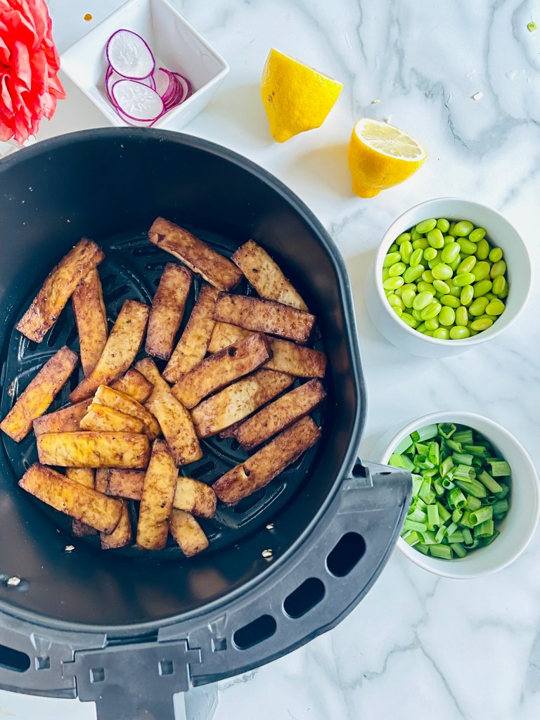When the air fryer is fully preheated, add in the marinaded tofu and bake it for 20 minutes.