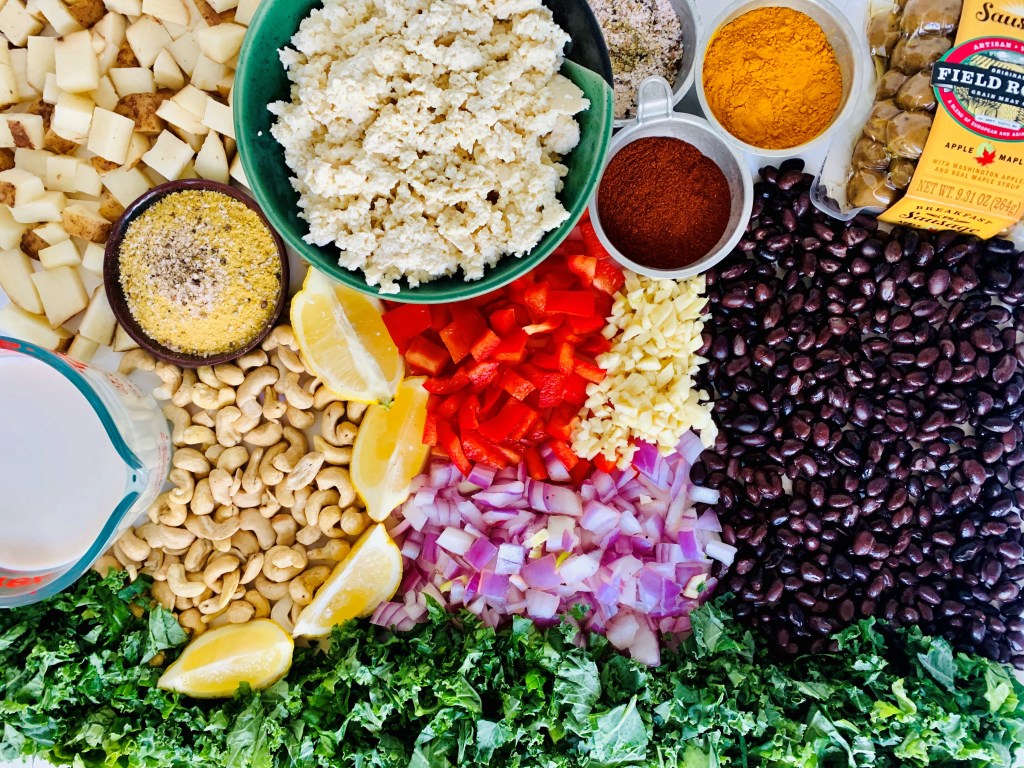 If your cashews are good to go, begin to prep all of your veggies, tofu, and beans.