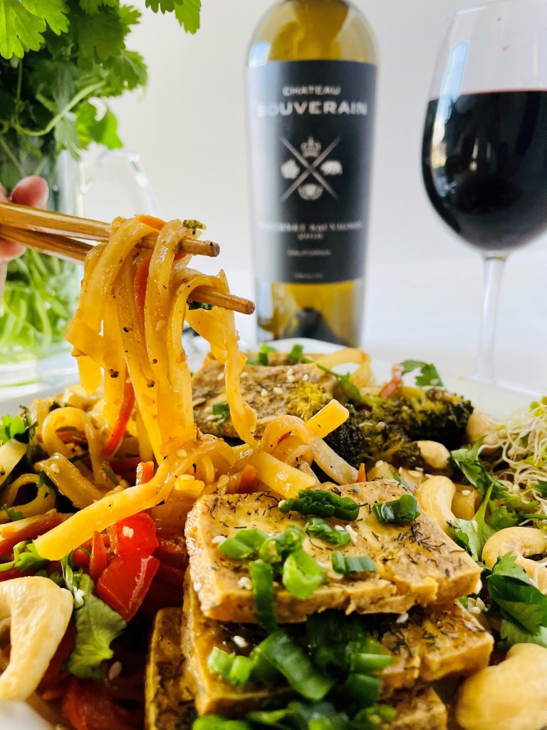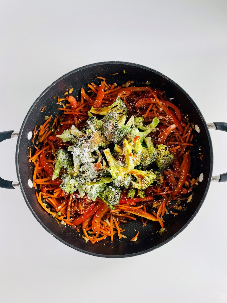 While the tofu is cooking, place the fully soaked noodles into your veggie mixture and stir until fully combined.