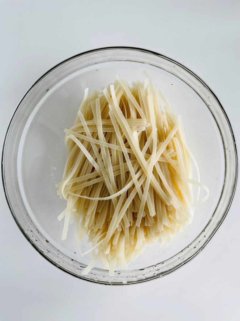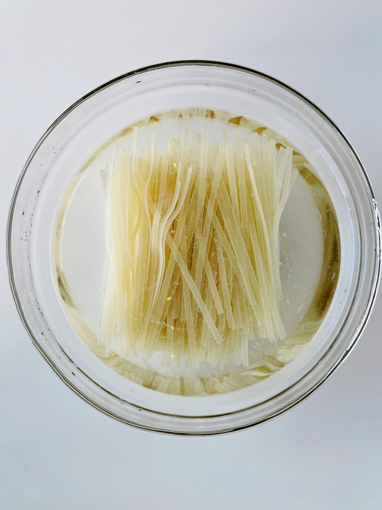First, soak the noodles by placing them in at least 8 or so cups of very hot tap water into a large mixing bowl and let them soak for 30 minutes.