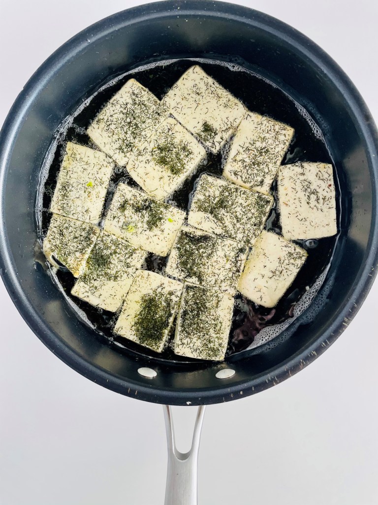 After you have sliced the tofu into thin slivers, drop down the sliced tofu into the sesame oil, dash on a bit of dill weed and salt, and let it cook on each side for around 5 to 7 minutes or until you see the edges start to turn crispy.