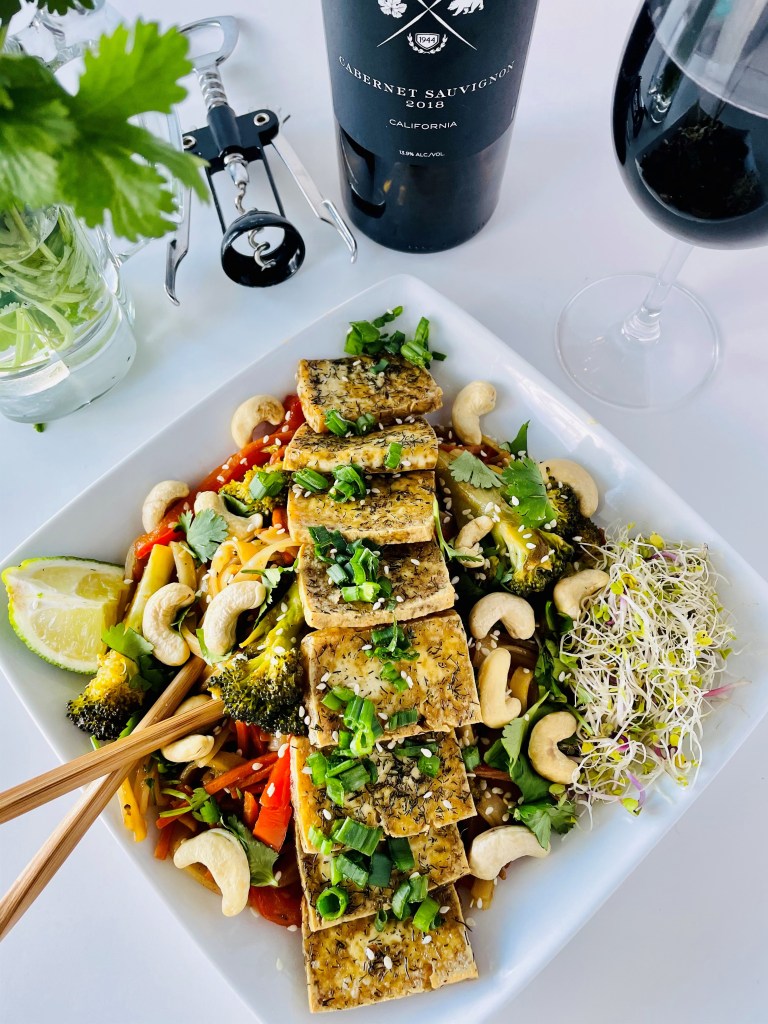Finally, add the noodles and veggies to a plate, squeeze half a lime over them, then top with the tofu, green portions of the green onions, alfalfa sprouts, cilantro, raw cashews, and sesame seeds.