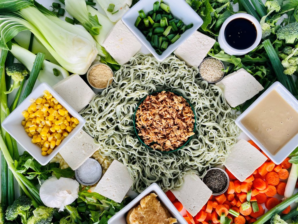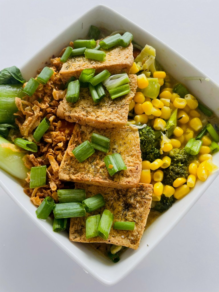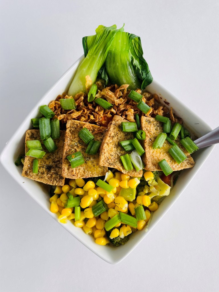 Finally, plate up this dish by adding your ramen noodles to a bowl, pour over the veggie broth mixture, spread the tofu down the middle, followed by the bok choy on one side and the yellow corn on the other.