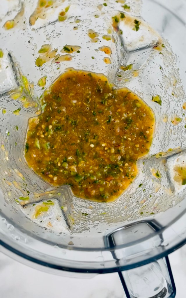 Add the peeled tomatoes to a blender and gently pulse them with the red onion, garlic, green pepper, Serrano peppers, lime juice, salt and pepper until you have a chunky and delicious salsa.