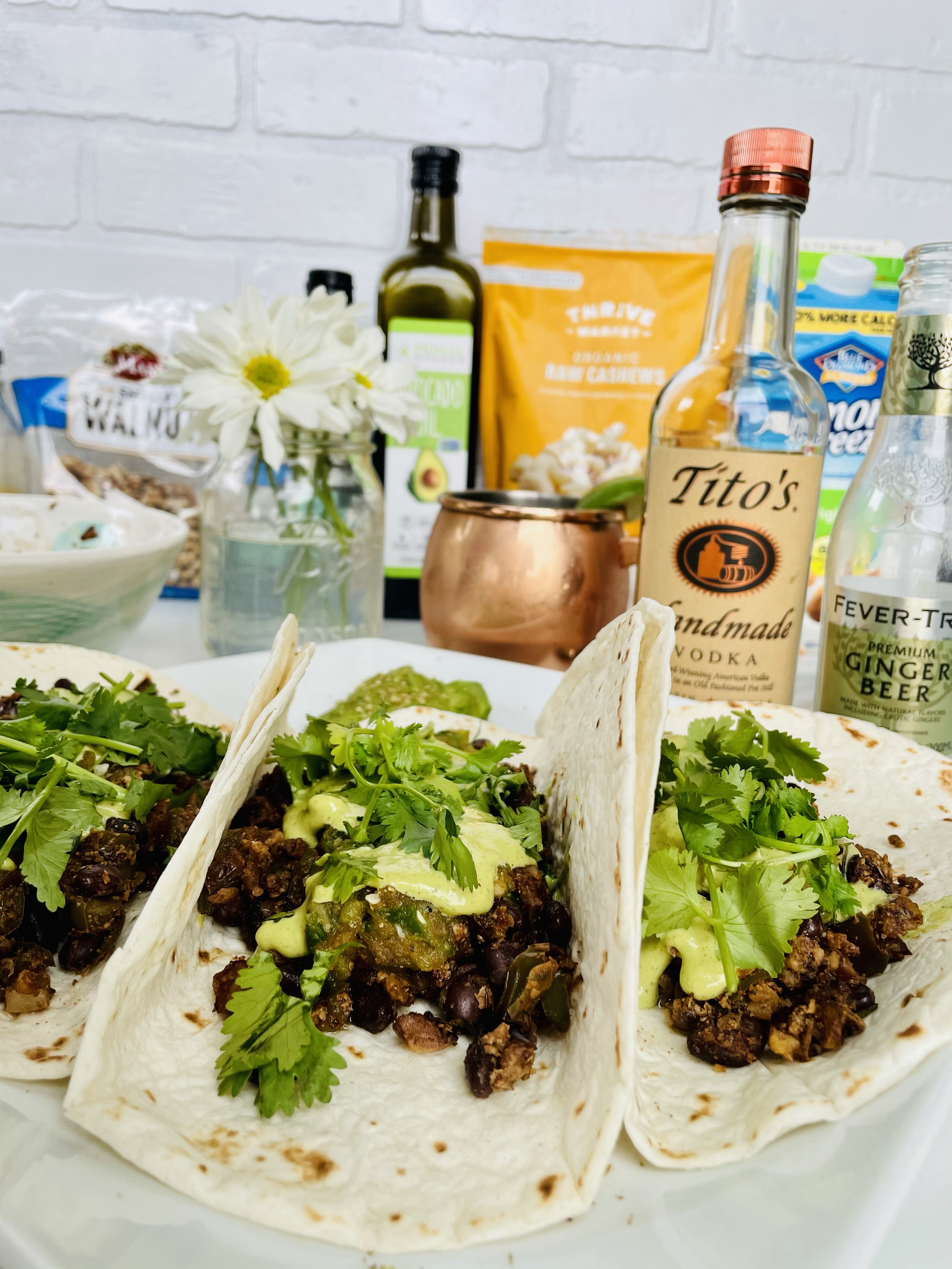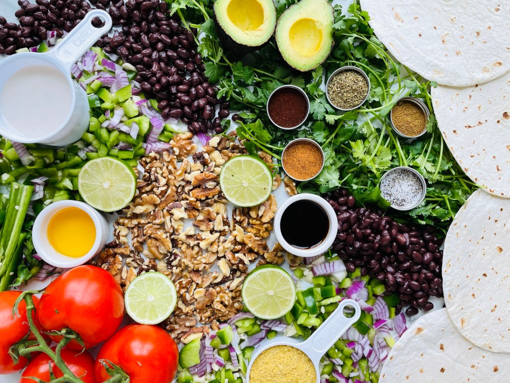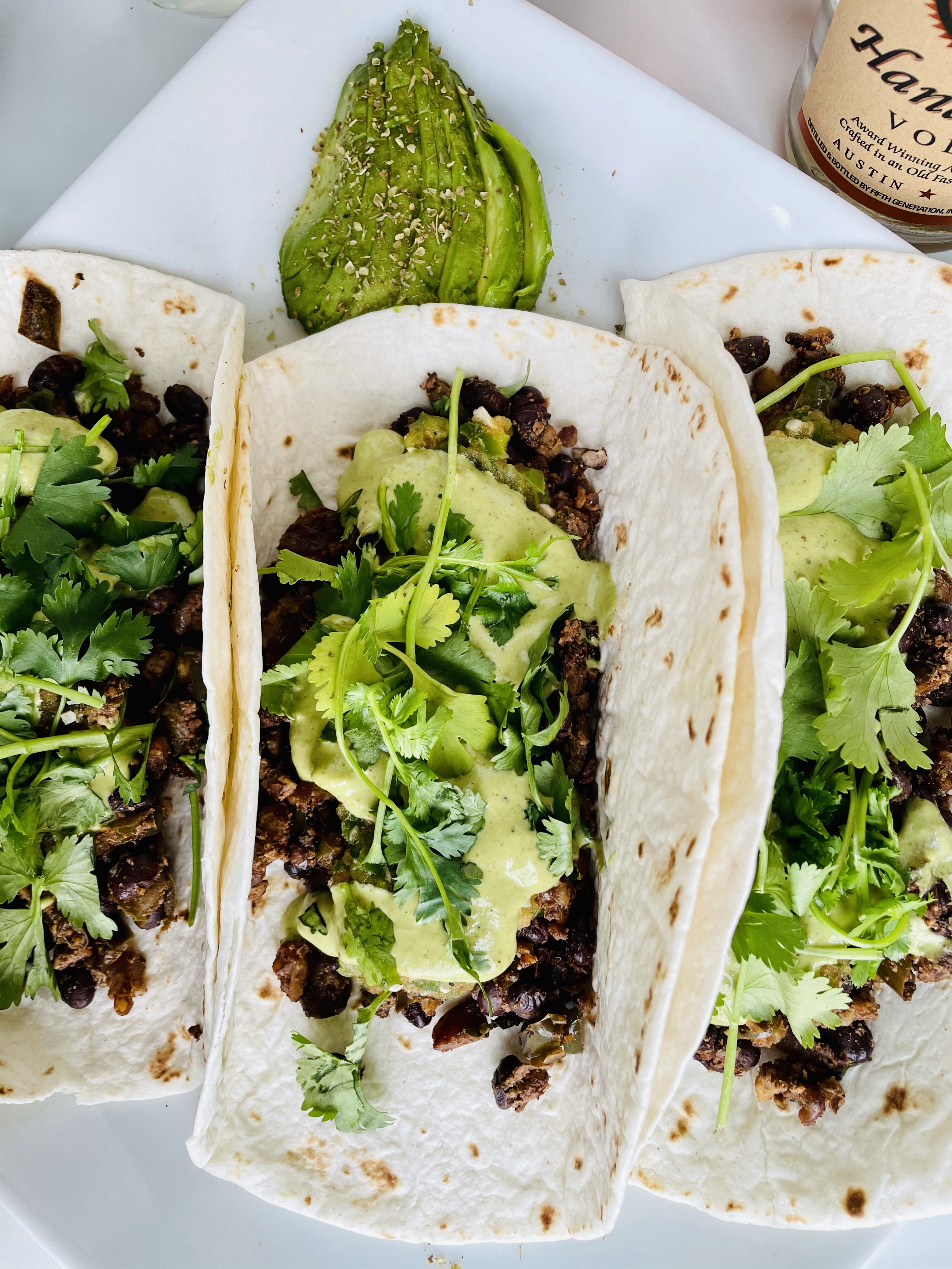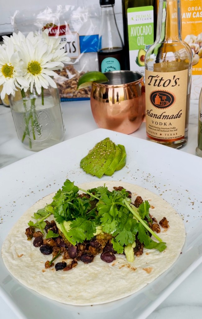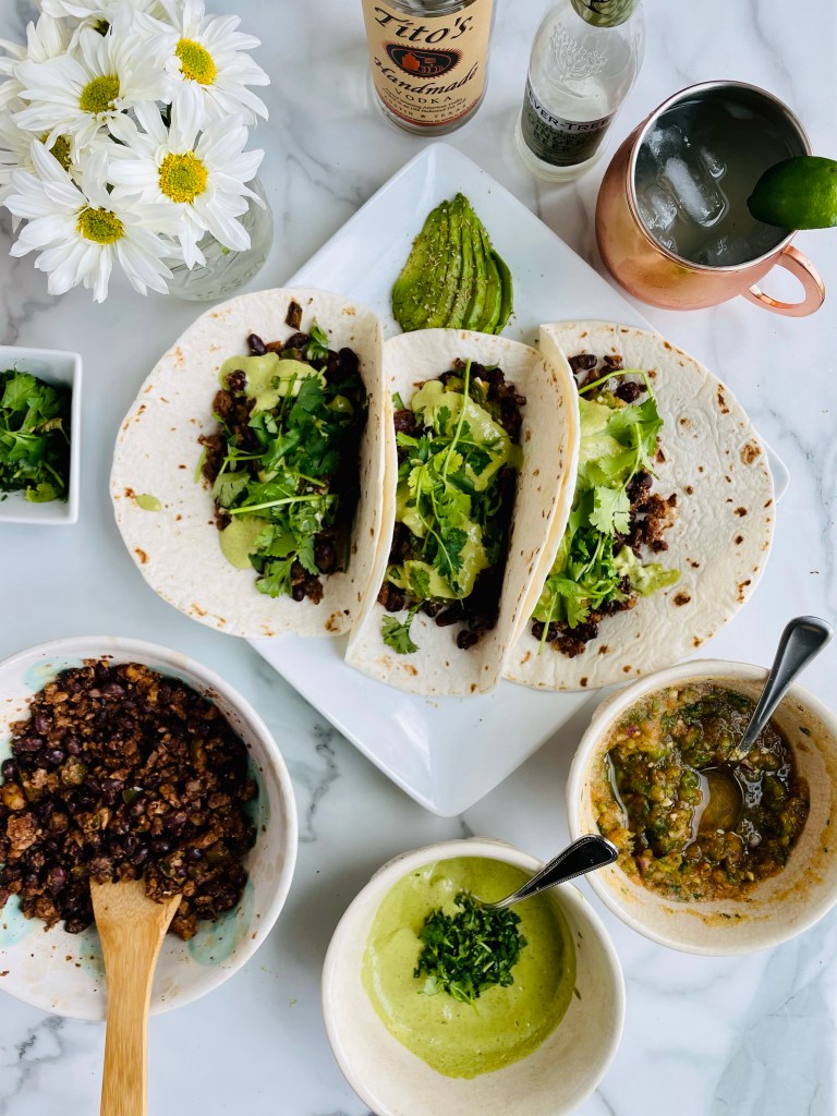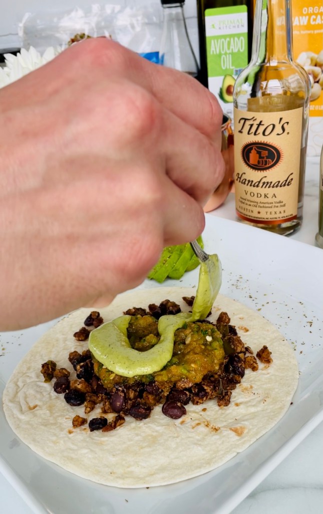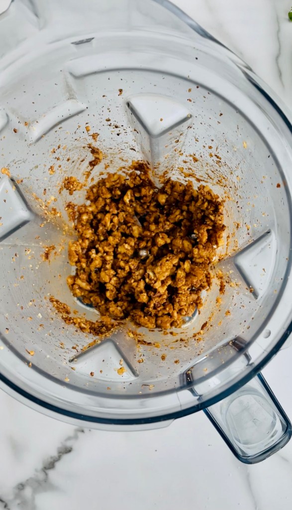 In a high speed blender, pulse together the walnuts, tamari, cumin, chili powder, salt and pepper, then add it into your large saucepan to let it all simmer one last time for a nice 10 or so minutes. Turn to low heat or set aside until you’re ready to plate your tacos.