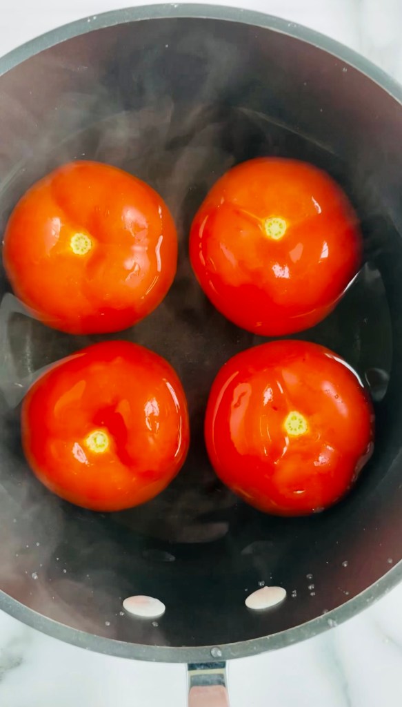 Finally, we move onto the salsa by preparing the tomatoes to be skinned. To do this, boiling a few cups of water, drop in the tomatoes, and cover them for around 4 to 5 minutes. By then, you should be able to scoop them out of the pot and carefully peel the skin off.