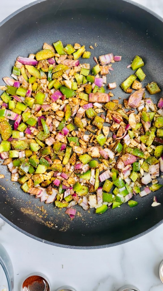 After pulsing the walnuts, spices, and tamari(gluten-free soy sauce), I added them into a heated saucepan with avocado oil, freshly minced garlic, red onions, and green peppers seasoned with dried oregano, cumin, cayenne pepper, salt and pepper to be sautéed and simmered for up to 15 minutes.